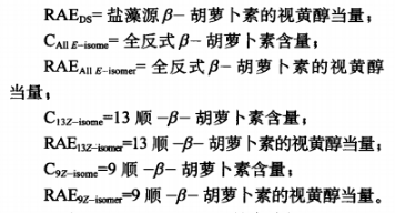 因?yàn)辂}藻源β-胡羅卜素成分帶有多種多樣幾何圖形同分異構(gòu)體,其視黃醇劑量可按式(10)測算。因?yàn)楦黜樖酵之悩?gòu)體的視黃醇劑量末見報(bào)導(dǎo),鹽藻源β-胡羅卜素的視黃醇劑量現(xiàn)階段不明。