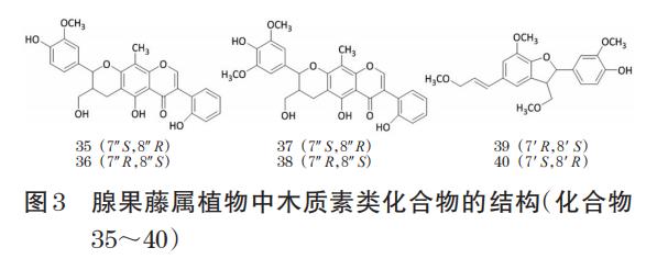 木脂素類物質(zhì)的基本上框架由兩個苯丙素單匯聚而成,極少數(shù)化學(xué)物質(zhì)也是有三聚和四聚等種類。Liu等從膠果樹綠色植物葉中分離出來評定出4個大豆異黃酮并木脂素類物質(zhì)(化學(xué)物質(zhì)35~38)和兩個新木脂素類物質(zhì)(化學(xué)物質(zhì)39~40)。在其中,大豆異黃酮并木脂素類物質(zhì)是以膠果樹中看到的首類以吡喃環(huán)為特點(diǎn)的化學(xué)物質(zhì),并推斷出生成方式。果藤屬綠色植物中木質(zhì)纖維素類物質(zhì)的有機(jī)化學(xué)構(gòu)造見圖3,其有關(guān)信息見表3。