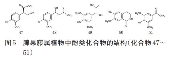 酚類在綠色植物中遍布覆蓋面廣、類型多,一般以酚的化合物方式存有。Kuo等從臺灣的膠果樹中分離出來評定出五個酚類(化學(xué)物質(zhì)47~51),在其中化學(xué)物質(zhì)48、49、50為初次從全部大自然中分離出來得到。腺果藤屬綠色植物中酚類的構(gòu)造見圖5,其有關(guān)信息見表5。