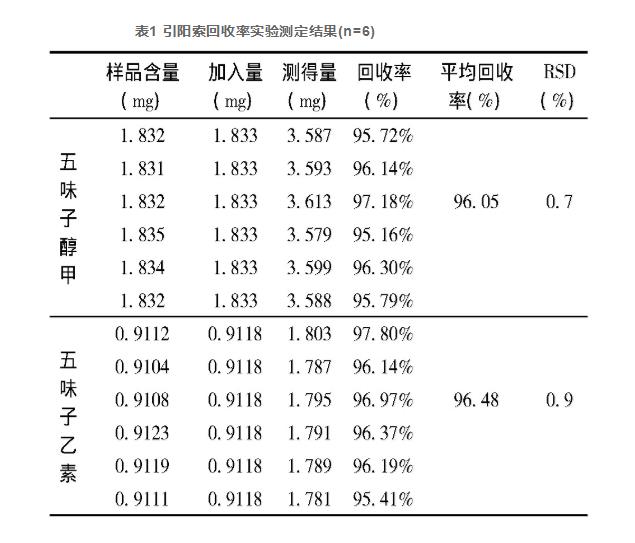 各自高精密稱量已經(jīng)知道成分的引陽索(生產(chǎn)批號(hào)20180604)約2.5g,6份,各自置100mL錐形瓶中,各自高精密添加對(duì)比水溶液:五味子醇甲對(duì)比水溶液(0.9165mg·mL-1)、五味子乙素(0.9118mg·mL-1)、各2.0、1.0mL,按“3.2.2”條方式制取供試水溶液,氣相10μL,結(jié)果測(cè)得五味子醇甲、五味子乙素均值利用率各自為96.05%(RSD=0.7%,n=6)、96.48%(RSD=0.9%,n=6),結(jié)果見表1。
