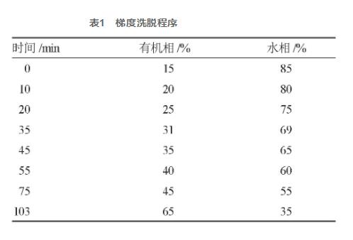 選用Shim-Pack XR-ODS Ⅲ (2.0 mmi.d×150 mm)離子交換柱,用工業(yè)甲醇-0.3%苯甲酸溶液為流動(dòng)性相系統(tǒng)軟件梯度方向過柱,流動(dòng)速度為0.2 mL·min-1,梯度方向過柱,檢驗(yàn)光波長為297 nm,柱溫為25 ℃,氣相量為10 μL。梯度方向見表1。