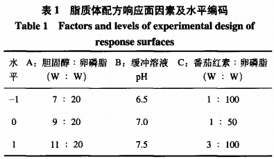 依據(jù)單要素實(shí)驗(yàn)效果和Box-Benhnken實(shí)驗(yàn)結(jié)構(gòu)設(shè)計(jì),挑選對(duì)番茄素脂質(zhì)體危害明顯的秘方構(gòu)成要素開(kāi)展響應(yīng)面試驗(yàn)設(shè)計(jì),如表1所顯示。