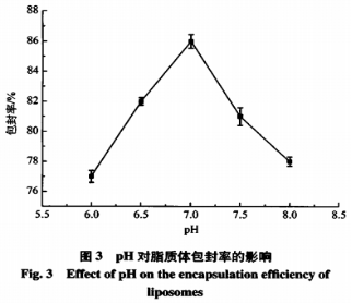 pH對脂質(zhì)體的包裹率如圖所示3所顯示,pH為7.0時,脂質(zhì)體包裹率做到最高值,再次升高pH,脂質(zhì)體包裹率降低。這是由于pH危害脂質(zhì)體表層正電荷,正電荷的更改會危害脂質(zhì)體的構(gòu)造可靠性。脂質(zhì)體雙分子結(jié)構(gòu)層顯得松散,直徑增大,使所述藥品水溶液滲入出去,進而危害芯板的包埋。