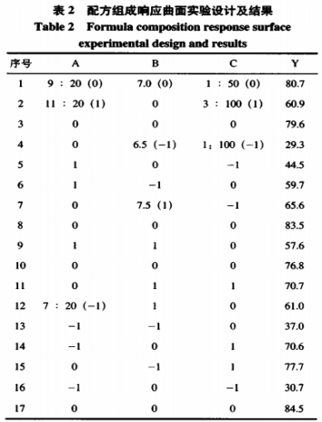 依據(jù)單要素試驗結(jié)果,以包裹率是指標,依照Box-Benhnken實驗結(jié)構(gòu)設計開展3要素3水準的響應面提升實驗,試驗設計及結(jié)果如表2所顯示。