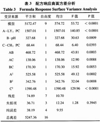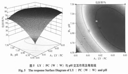 LY:PC(W:W)和緩沖液pH,CH:PC(W:W)和LY:PC(W:W),CH:PC(W:W)和緩沖液pH對包裹率的3d圖紙均呈雙曲線狀,等高線圖呈扁圓形。即LY:PC(W:W)和緩沖液pH,CH:PC(W:W)和LY:PC(W:W),CH:PC(W:W)和緩沖液pH的配對t檢驗對包裹率都是有明顯危害。LY:PC(W:W)和緩沖液pH配對t檢驗的3d圖紙較陡,且等值線聚集。表明LY:PC(W:W)和緩沖液pH配對t檢驗對包裹率的危害更明顯,即LY:PC(W:W)和pH對包裹率危害更顯著。