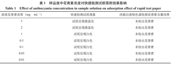 結(jié)果顯示,當(dāng)試品液中原花青素濃度值在0.01~5mg/mL時(shí),迅速檢測試紙對(duì)原花青素不造成合理吸咐。