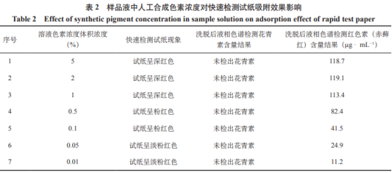 以紅提暗紫色黑色素服用添加物為物質(zhì)的量濃度,以0.5mg/mL的原花青素水溶液為有機(jī)溶劑,各自配置容積含量為5%、2%、1%、0.5%、0.1%、0.05%、0.01%的紅提暗紫色黑色素(在其中帶有赤蘚紅)服用添加物水溶液,各自用迅速檢測試紙吸咐七種水溶液中的原花青素及人造黑色素,觀查狀況。用1mL工業(yè)甲醇將測紙上離子液體過柱到1mL離心管架中,混勻,進(jìn)到液相色譜儀檢驗(yàn)其花青色以及鮮紅色黑色素成分。實(shí)際狀況,檢驗(yàn)效果及剖析,見表2、圖2所顯示。