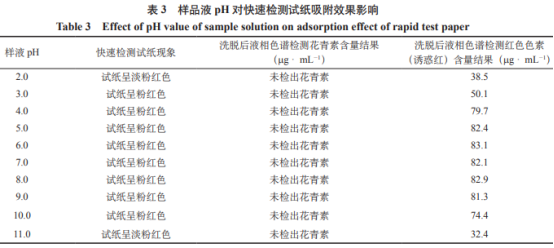 各自用0.05mol/LpH為2.0、3.0、4.0、5.0、6.0、7.0、8.0、9.0、10.0、11.0的乙酸銨緩沖溶液,配置0.5mg/mL的原花青素和0.5%葡萄籽紅鮮紅色人造黑色素水溶液,各自用迅速檢測試紙吸咐七種水溶液中的原花青素及人造黑色素,觀查狀況,檢驗(yàn)效果及剖析,見表3所顯示。