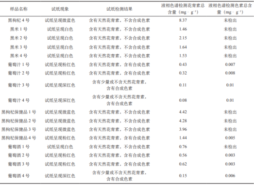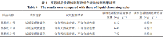 從甘肅蘭州每個(gè)商場、農(nóng)貿(mào)批發(fā)市場、小攤點(diǎn)等場地,隨機(jī)抽取野生黑枸杞試品4份,黑豆試品4份,果汁試品4份,野生黑枸杞飲品及保健產(chǎn)品4份,紅酒試品4份,稱量固體試品5.0g,添加20mL純凈水,開水浴獲取10min,制冷至室內(nèi)溫度,汲取萃取液2mL,添加純凈水10mL,獲得有色彩且通透的試品液,將試小紙條一端侵潤在試品液中,維持30s后取下觀查著色轉(zhuǎn)變。稱量液體試品10g。添加10mL水。將制作好的試小紙條侵潤在上清液中,維持30s后取下觀查著色轉(zhuǎn)變。稱量液體試品10g。水浴加熱去除乙醇,添加10mL水,將制作好的試小紙條侵潤在上清液中,維持30s后取下觀查著色轉(zhuǎn)變,應(yīng)用迅速檢測試紙,辨別以上樣本中是不是帶有人力添生成黑色素。融合高效率液相色譜儀,檢驗(yàn)試樣中原花青素成分和人造黑色素成分。比照并剖析迅速檢測試紙與高效率液相色譜儀檢驗(yàn)結(jié)果。實(shí)際結(jié)果見表4所顯示。