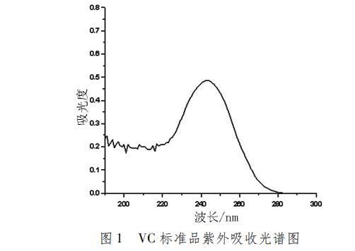 由圖1及圖2能夠 看得出維他命C標(biāo)準(zhǔn)物質(zhì)的λmax=243nm,新鮮水果試品的λmax=244nm,他們的最高消化吸收光波長基本上一致,這表明維他命C在酸性溶液中的最高消化吸收光波長為243nm。