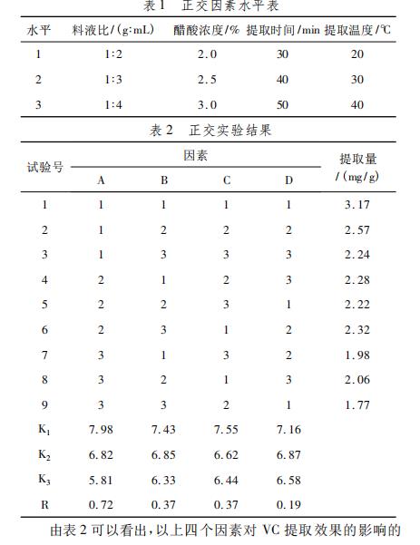由表2能夠 看得出,之上四個要素對VC獲取實(shí)際效果的不良影響的層次次序先后為A>B=C>D,即:料液比>冰醋酸濃度值=獲取時間>獲取溫度。從正交和分析數(shù)據(jù)能夠 得到,維他命C的較佳獲取標(biāo)準(zhǔn)為A1B1C1D1,即:料液比1∶2(g∶mL)、冰醋酸濃度值2%、獲取時間30min及其獲取溫度20℃。