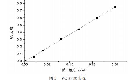 本試驗(yàn)選用紫外線-由此可見光度法對VC的成分開展了測量,將1mg/mL的VC規(guī)范貯備液梯度方向稀釋液為0.02,0.04,0.08,0.12,0.16,0.20mg/mL的系列產(chǎn)品水溶液各自檢驗(yàn)其OD值。以濃度值為橫坐標(biāo)軸,OD值為縱軸制作維他命C標(biāo)曲(見圖3)。