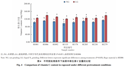 前一種處理方法下八個油菜子試品中維他命C成分的平均數(shù)為115.71mg/100g,后面一種其均值為99.96mg/100g(圖4)。運用液態(tài)氮碾磨過后的油菜子試品所測量的維他命C成分明顯高過未碾磨加工處理的試品。所選定的8種油菜子試品碾磨以后較未碾磨時的維他命C成分各自提高了16%、15%、14%、16%、17%、11%、20%、18%,測得維他命C的成分均值提升了約16%。表明運用液態(tài)氮將試樣碾磨成粉狀后,再用均質機開展勻漿解決,更為有益于油菜子試品中維他命C的徹底獲取。