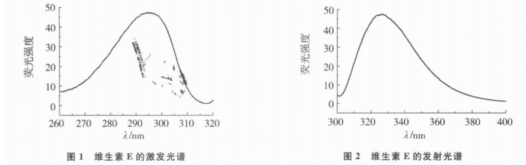 用含維生素E2.0mg/L的規(guī)范乙醇溶液作校準光譜儀數(shù)次試驗說明,維生素E的激發(fā)光譜和光譜分析法均為λex295nm/λem327nm,結(jié)果見圖1和圖2,與項光明、李艷飛等的報導相符合。