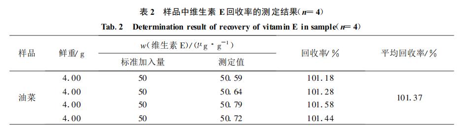 取同樣品質(zhì)的油菜子試品,各自添加一定量的維生素E的標液,按以上測定法各自做好解決、測量,測算試品中維生素E的利用率(表2)。從表2能夠 看得出,利用率為101.18%~101.58%,均值利用率為101.37%。