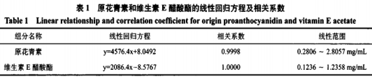高精密稱量105℃干躁至恒重的花青素標準品28.63mg和維生素E冰醋酸酯標準品12.42mg于同一個10mL容量瓶中,加適當工業(yè)甲醇融解并稀釋液至標尺,混勻,獲得混和標準品儲備液。該儲備液遮光儲存?;旌鸵?guī)范儲備液適當,逐步稀釋液,配置成花青素濃度值為0.2806、0.8417、1.4028、1.9640、2.8057mg/mL,維生素E冰醋酸酯濃度值為0.1236、0.3707、0.6179、0.8651、1.2358mg/mL的混和標液,以十八烷基氯硅烷引線鍵合硅橡膠為填充料,DikmaDiamons訂C18(4.6mm×150mm,5μm);流動性相:工業(yè)甲醇;流動速度:1.0mL/min;檢驗光波長:284nm柱溫:30℃;進樣量:10μL。的色譜儀標準氣相剖析,紀錄色譜。以峰總面積積分數(shù)值縱軸,標準品濃度值為橫坐標軸,開展回歸分析,花青素在0.2806~2.8057mg/mL濃度值范疇內(nèi),維生素E冰醋酸酯在0.1236~1.2358mg/L濃度值范疇內(nèi)呈優(yōu)良的線性相關(guān)。二者的線形相關(guān)系數(shù)r均為0.999之上,兩成分線形線性回歸方程、相關(guān)系數(shù)r如表1所顯示。