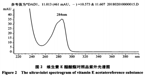將維生素E冰醋酸酯標準品水溶液引入液相色譜(配置DAD紫外線探測器),打開光譜儀收集,在主成份峰部位觀查較大消化吸收光波長(見圖2)。結(jié)果顯示:維生素E冰醋酸酯標準品的最高消化吸收光波長與檢驗光波長284nm一致。