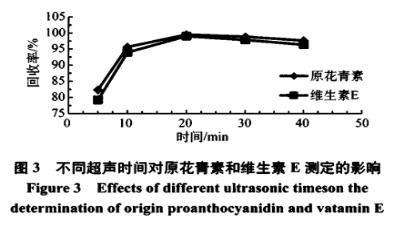 本實驗與此同時調(diào)查5個不一樣超聲波獲取時間,各自為5min,10min,20min,30min,40min,對花青素及維生素E加標試品的獲取實際效果,利用率隨時長轉(zhuǎn)變關(guān)聯(lián)如圖所示3。
