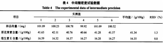 稱量葡萄籽維生素E膠囊(生產(chǎn)批號(hào)20190115)內(nèi)容物6份,每一份約100mg,高精密稱取,高精密稱量葡萄籽維生素E膠囊(生產(chǎn)批號(hào)20190115)內(nèi)容物0.1g于25mL量杯中,添加10mL工業(yè)甲醇,放置70℃水浴中加溫,振搖使內(nèi)容物分散化,馬上遷移至25mL容量瓶中,再用10mL工業(yè)甲醇分三次清洗量杯,清洗液轉(zhuǎn)到容量瓶,超聲波獲取20min,取下,制冷至室內(nèi)溫度,用工業(yè)甲醇滴定劑至標(biāo)尺,混勻,經(jīng)0.22μm微孔濾膜過慮,做為供試品水溶液。采用不一樣離子交換柱、不一樣高效率液相色譜各自測(cè)量試品中花青素與維生素E成分,隨后各自對(duì)兩成分6個(gè)成分?jǐn)?shù)據(jù)信息開展相對(duì)性相對(duì)標(biāo)準(zhǔn)偏差統(tǒng)計(jì)分析,獲得兩成分的含量的RSD均低于1.5%,說明應(yīng)用該方式正中間精度優(yōu)良(見表4)。