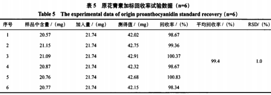 稱量已經(jīng)知道花青素與維生素E成分的葡萄籽維生素E膠囊(生產(chǎn)批號(hào)20190115)內(nèi)容物約50mg,共6份,高精密稱取,向試品中添加花青素與維生素E冰醋酸酯混和標(biāo)準(zhǔn)品儲(chǔ)備液(花青素5.435lmg/mL,維生素E冰醋酸酯2.1283mg/mL)4mL,高精密稱量葡萄籽維生素E膠囊(生產(chǎn)批號(hào)20190115)內(nèi)容物0.1g于25mL量杯中,添加10mL工業(yè)甲醇,放置70℃水浴中加溫,振搖使內(nèi)容物分散化,馬上遷移至25mL容量瓶中,再用10mL工業(yè)甲醇分三次清洗量杯,清洗液轉(zhuǎn)到容量瓶,超聲波獲取20min,取下,制冷至室內(nèi)溫度,用工業(yè)甲醇滴定劑至標(biāo)尺,混勻,經(jīng)0.22μm微孔濾膜過慮,做為供試品水溶液。離子交換柱:以十八烷基氯硅烷引線鍵合硅橡膠為填充料,DikmaDiamons訂C18(4.6mm×150mm,5μm);流動(dòng)性相:工業(yè)甲醇;流動(dòng)速度:1.0mL/min;檢驗(yàn)光波長:284nm柱溫:30℃;進(jìn)樣量:10μL。測(cè)得花青素與維生素E兩成分的加標(biāo)回收率均值各自為95.4%、99.0%,RSD各自為2.3%、1.2%,實(shí)驗(yàn)結(jié)果見表5、表6,說明應(yīng)用本方式檢驗(yàn)利用率較高,精確度優(yōu)良,結(jié)果靠譜。