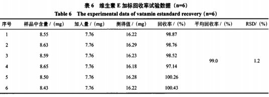 實(shí)驗(yàn)中,具體添加的標(biāo)準(zhǔn)品為維生素E冰醋酸酯(添加量為8.5132mg),換算成維生素E(以α-維他命d計(jì))的量為7.76mg,換算方式:維生素E(以α-維他命d計(jì))/mg成分=維生素E冰醋酸酯/mg×430.71/472.75(在其中,430.71為α-維他命d的相對(duì)分子質(zhì)量,472.75為DL-α-冰醋酸維他命d(即維生素E冰醋酸酯)相對(duì)分子質(zhì)量,參照規(guī)范GB1886.233—2016《食品安全國家標(biāo)準(zhǔn)食品添加劑維生素E》)。