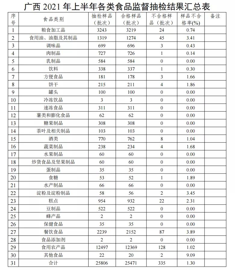 依據(jù)廣西自治區(qū)銷售市場監(jiān)督管理局食品衛(wèi)生安全監(jiān)管抽樣檢驗(yàn)工作部署和方案分配,2021年上半年度我區(qū)共進(jìn)行抽樣檢驗(yàn)并發(fā)布25806批號(hào)食品類試品,達(dá)標(biāo)試品25471批號(hào),不過關(guān)試品335批號(hào),整體不過關(guān)試品診斷率為1.30%,與2020年同比增加降低了0.45個(gè)點(diǎn)。下邊,就要大家一起來看看哪種食品質(zhì)量安全最扎實(shí)吧: