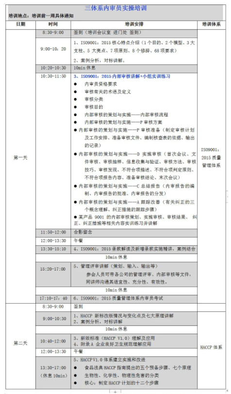 現(xiàn)階段ISO9001剛嫻熟應用2015版,GB/T22000又要在2021年7月1日進行緩沖期,HACCPV1.0管理體系也于7月30日發(fā)布,并于2022年12月31日進行銜接。而要想根據(jù)并搞好 IS09001:2015 品質體系管理、ISO22000:2018 食品衛(wèi)生安全體系管理、HACCP V1.0 管理體系認證的一個前提條件,公司需要具有對體系管理有帶領、具體指導和監(jiān)管功能的內部質量監(jiān)督員。提高內審員的管理體系工作能力相對于公司而言至關重要。