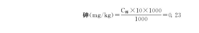 荼葉試品采自金華市龍?zhí)赌巢鑸觯粯忧闆r下,依據(jù)砷試品OD值與標(biāo)液工作中曲線圖測量,測出A樣=0.030,由標(biāo)曲可獲得砷樣濃度值為:C樣=0.023μg/mL,根據(jù)試品加工處理方式10mL為1g試品。