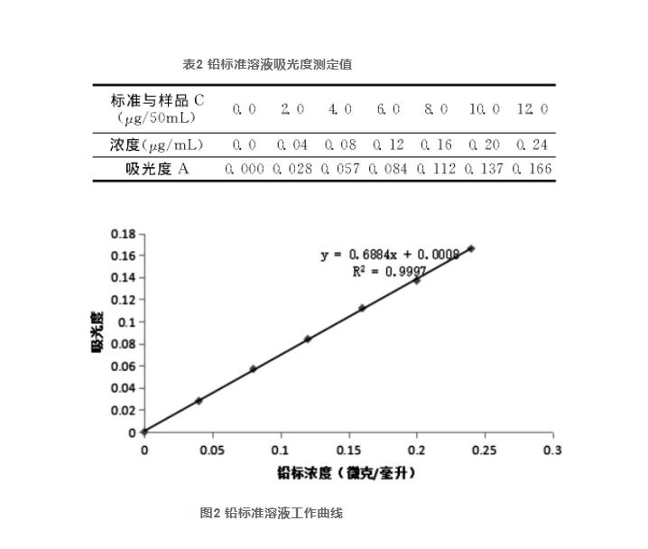 上式結(jié)果:實(shí)驗(yàn)室得砷成分為0.23mg/kg,此項(xiàng)指標(biāo)值合乎在我國國家行業(yè)標(biāo)準(zhǔn)不可高過0.5mg/kg的規(guī)定。2.3 鉛工作中曲線圖
