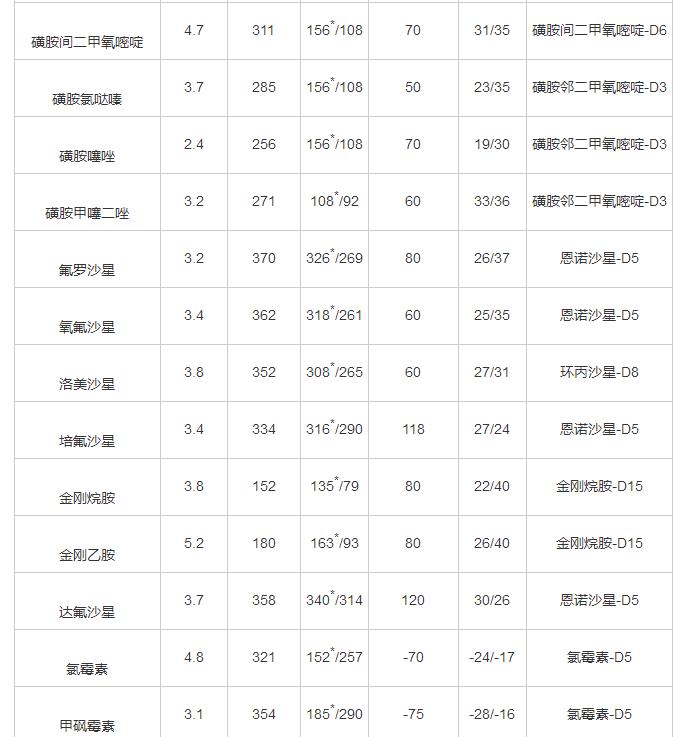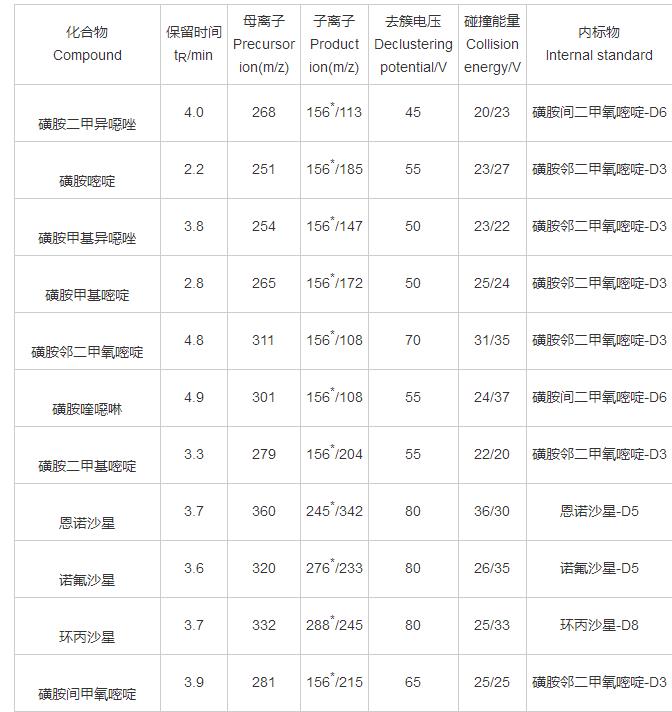 ESI離子源;離子源溫度550℃;噴霧器氣(GS1)工作壓力0.379MPa;輔助加溫氣(GS2)工作壓力0.379MPa;氣簾氣工作壓力0.241MPa;正、空氣負(fù)離子方式與此同時(shí)掃描儀,在其中氯霉素類(lèi)藥為空氣負(fù)離子方式掃描儀,噴霧器工作電壓-4500V,多反映檢測(cè)方式(MRM);磺胺類(lèi)、氟喹諾酮、金剛烷胺類(lèi)為共價(jià)鍵方式掃描儀,噴霧器工作電壓5500V,多反映檢測(cè)方式,別的質(zhì)譜分析主要參數(shù)列于表1。