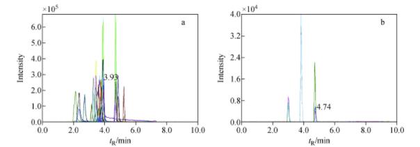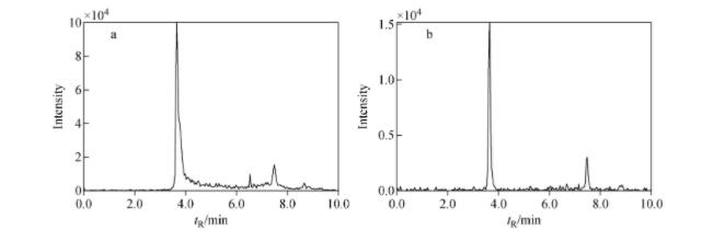 根據(jù)針泵以流動(dòng)性注入的方法對(duì)1.3節(jié)配置的標(biāo)液開(kāi)展剖析,為每一個(gè)被測(cè)藥品選擇回應(yīng)較高的2對(duì)離子對(duì),為內(nèi)標(biāo)物選擇回應(yīng)最大的1對(duì)離子對(duì),并提升相對(duì)應(yīng)的去簇工作電壓和撞擊能做為最開(kāi)始的質(zhì)譜分析主要參數(shù)。但在具體試品檢測(cè)中,環(huán)丙沙星-D8回應(yīng)最大的離子對(duì)峰受殘?jiān)宓挠绊懕容^嚴(yán)重,沒(méi)法精確積分。以生雞蛋為例子,其質(zhì)譜分析圖例于圖3a,一部分試品中殘?jiān)迮c恩諾沙星回應(yīng)最大的離子對(duì)峰徹底重合,導(dǎo)致正離子比例遠(yuǎn)遠(yuǎn)地超過(guò)容許偏移范疇,二者對(duì)判定和定量分析結(jié)果均有巨大危害,根據(jù)調(diào)節(jié)流動(dòng)性相無(wú)法將殘?jiān)c總體目標(biāo)物分離出來(lái)。因而,在達(dá)到敏感度要求的條件下,對(duì)恩諾沙星提升出第三高回應(yīng)離子對(duì),環(huán)丙沙星-D8提升出次高回應(yīng)離子對(duì),示于圖3b,有關(guān)主要參數(shù)列于表1。