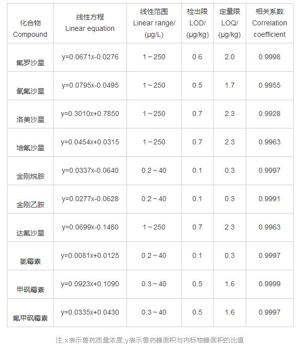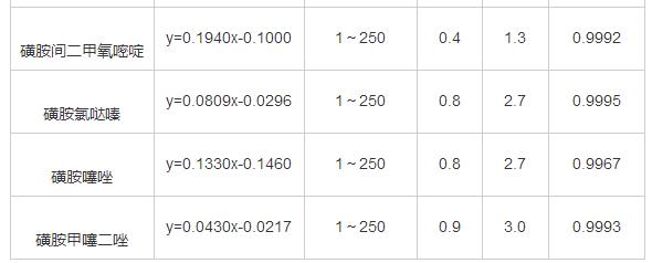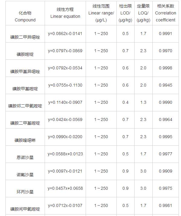 依據(jù)每一種藥品在設(shè)備上的敏感度,以空缺試品萃取液做為有機(jī)溶劑,將4類藥配置成一系列濃度值混和規(guī)范工作中水溶液,在提升的試驗(yàn)標(biāo)準(zhǔn)下測(cè)量,以藥品峰總面積與內(nèi)標(biāo)物峰總面積比率(y)對(duì)被測(cè)成分的濃度值(x)做圖,明確25種藥品的線性方程。在空缺試品中添加系列產(chǎn)品較低濃度的25種飼料規(guī)范液,各自以3倍和10倍頻率穩(wěn)定度(S/N)明確方法檢出限和定量限,列于表3。25種飼料在0.2~250μg/L濃度值范疇內(nèi)的線性相關(guān)優(yōu)良(相關(guān)系數(shù)r>0.99),方法檢出限和定量限各自為0.1~0.9μg/kg和0.3~3.0μg/kg。