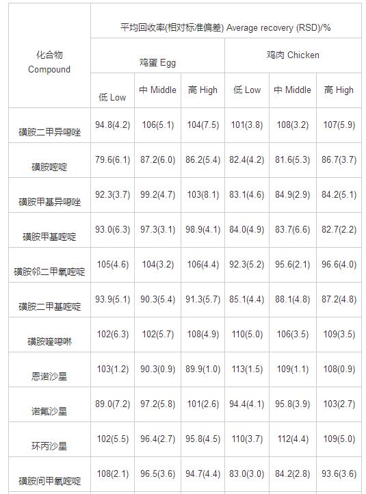 依據(jù)混和規(guī)范溶液的濃度,各自加上約1倍(低)、5倍(中)、20倍(高)定量限濃度值的25種標(biāo)液于生雞蛋和雞脯肉呈陰性試品中,每一個(gè)試品栽培基質(zhì)做6次平行面試驗(yàn),測(cè)算均值利用率及相對(duì)性相對(duì)標(biāo)準(zhǔn)偏差,結(jié)果列于表4。4類飼料的均值利用率為79.5%~119%,相對(duì)性相對(duì)標(biāo)準(zhǔn)偏差為0.9%~9.2%。