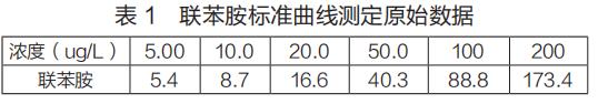 以提升后的色譜儀標準將標液系列產(chǎn)品由較低濃度的到濃度較高的先后進到高效率液相色譜瑩光探測器開展測量,以聯(lián)苯胺的濃度值(ug/L)為橫坐標軸,以其相應(yīng)的峰總面積為縱軸,創(chuàng)建一元線形線性回歸方程,數(shù)據(jù)信息詳細表1。標曲為Y=0.8701X-0.2952,線形指數(shù)r=0.9996。