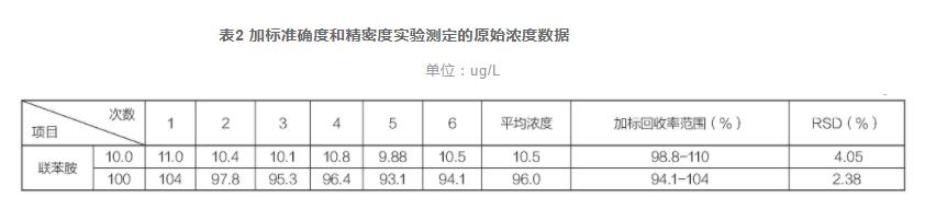 因當然水環(huán)境中聯(lián)苯胺成分極低,多見未驗出,因此自做基材加標試品做為具體試品開展剖析,與此同時做空缺試驗,測量結(jié)果詳細表4。