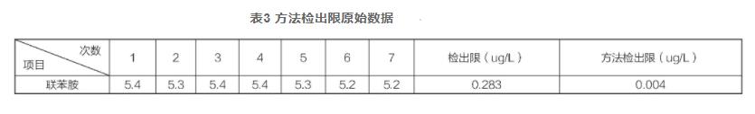 依照設(shè)備的最好標準,對5.00ug/L濃度值試品開展平行測定7次,根據(jù)計算方法:方法檢出限=t(n-1,0.99)×S,測算水體中聯(lián)苯胺的方法檢出限(t(n-1,0.99)數(shù)值3.143)。水體聯(lián)苯胺測量方法檢出限不大于方法檢出限(取水質(zhì)采樣150ml濃縮至2.0ml,濃縮75倍),結(jié)果詳細表3。
