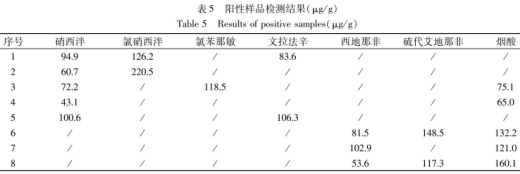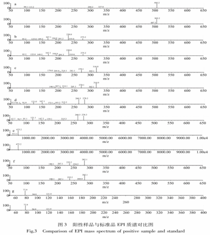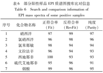 選用本方式對50批號消除疲勞類和提高睡眠質(zhì)量類保健產(chǎn)品開展檢驗,外標法定量分析。試驗數(shù)據(jù)顯示,驗出呈陽性試品共8批號,定量分析結(jié)果見表5。每批號呈陽性試品最少與此同時驗出二種違規(guī)加上藥品,在其中驗出數(shù)最多的化學(xué)物質(zhì)是硝西泮和炯酸,各驗出5批號,次之是他達那非,共驗出3批號,氯硝西泮、文法拉辛、硫代艾地那非各驗出2批號,氯苯那敏驗出1批號。全部呈陽性試品EPI譜圖均歷經(jīng)EPI數(shù)據(jù)庫查詢(2.3)核對確診,以Fit、RevFit和Purity三個主要參數(shù)表明查找結(jié)果,其標值反映與總體目標化學(xué)物質(zhì)的搭配水平。在其中FiL(F)意味著正符合率,即標準物質(zhì)譜峰與試品譜峰的相似性,最高值為100,值越大表明是該化學(xué)物質(zhì)的概率越大;RevFit(R)意味著反符合率,即試品譜圖與標準物質(zhì)譜圖的相似性;Purity(P)意味著純凈度,是綜合性前二種結(jié)果得到的標值,即試品譜圖與數(shù)據(jù)表中的標準物質(zhì)譜圖之問在質(zhì)量數(shù)、進化速率等主要參數(shù)層面的相似性。EPI數(shù)據(jù)庫查詢搜庫結(jié)果中總體目標化學(xué)物質(zhì)依照P值從大到小的排列順序;一部分呈陽性試品質(zhì)譜分析對比分析見圖3。