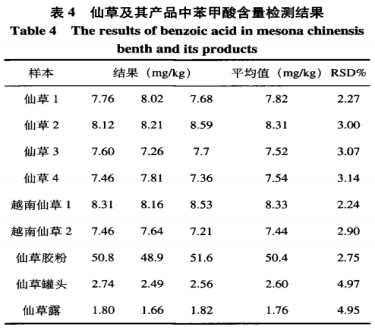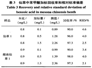 在2種不一樣原產(chǎn)地神仙草試品中分別加上0.1mg/L、0.5mg/L、1.5mg/L三個水準濃度值總體目標物標準物質(zhì),每一個水準反復(fù)測試6次,開展利用率和精度測算,均值利用率在90.0%~98.0%中間,相對性相對標準偏差在(RSD)2.1%~4.6%中間,結(jié)果見(見表3)。