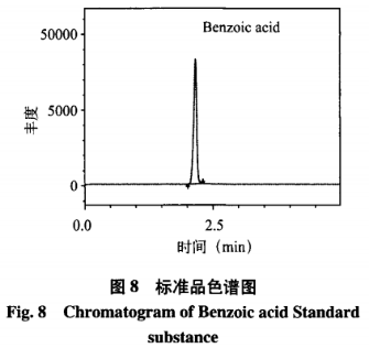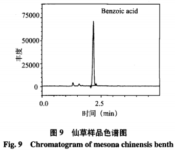 本科學(xué)研究創(chuàng)建的辦法對神仙草、神仙草樹脂膠粉、涼皮水果罐頭、神仙草露等試品開展檢測,幾類神仙草以及生產(chǎn)商品中都驗出了苯甲醛,在其中苯甲醛成分:神仙草在7.52mg/kg~8.33mg/kg間,神仙草樹脂膠粉50.4mg/kg,涼皮水果罐頭2.60mg/kg,神仙草露1.76mg/kg,(見表4)。苯甲醛標準物質(zhì)和神仙草試品色譜各自見圖8、圖9。