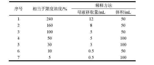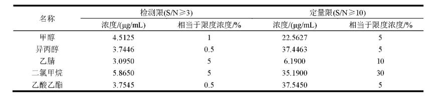 各自稱量工業(yè)甲醇,等保,乙腈,二氯甲烷,乙酸丁酯適當,高精密稱取,添加N-羥基二丙二醇丁醚逐步稀釋液成一系列濃度值的水溶液,按“2.1.1”項下色譜儀標準測量,紀錄色譜。取頻率穩(wěn)定度約為3做為檢出限水溶液,取頻率穩(wěn)定度約為10做為定量限水溶液,實驗結果見表3。