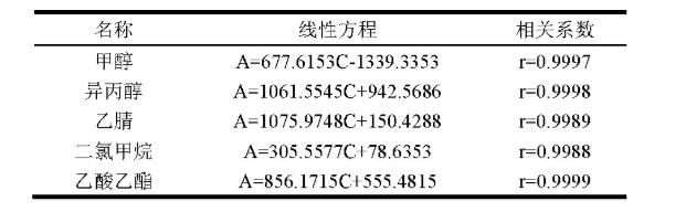 高精密稱量工業(yè)甲醇標準品451.3mg、等保標準品749.0mg、乙腈標準品61.9mg、二氯甲烷標準品117.3mg和乙酸丁酯標準品751.2mg,置同一100mL量瓶中,用N-羥基二丙二醇丁醚稀釋液至標尺,混勻,得標準品水解液,量取標準品水解液按表1用N-羥基二丙二醇丁醚逐漸稀釋液成一系列濃度值。高精密量取1.0μl,引入氣相色譜,開展檢驗。線形結果見表2。