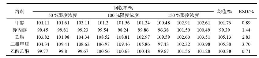 實驗結果顯示,各有機溶劑在定量限濃度值下反復氣相檢驗,峰總面積RSD<10.0%,保存期RSD≥1.0%,說明本方式氣相精度優(yōu)良。