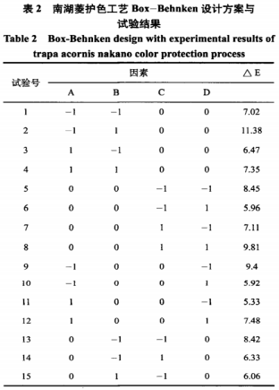 在正交實(shí)驗(yàn)設(shè)計(jì)方案中,依據(jù)單要素實(shí)驗(yàn)結(jié)果,選擇解決時(shí)間、抗壞血酸、檸檬酸鈉和乙二胺四乙酸二鈉為實(shí)驗(yàn)要素,各自用A、B、C、D先后表明解決時(shí)間、抗壞血酸、檸檬酸鈉和乙二胺四乙酸二鈉等4個(gè)危害南湖菱固色實(shí)際效果的要素開展調(diào)查,以偏色綜合性鑒定指標(biāo)值△E做為響應(yīng)值,用于評(píng)定偏差。設(shè)計(jì)方案四要素三水準(zhǔn)的響應(yīng)分析試驗(yàn),創(chuàng)建二次多項(xiàng)式回歸分析,各實(shí)驗(yàn)要素水準(zhǔn)及編號(hào)設(shè)計(jì)方案見表1。