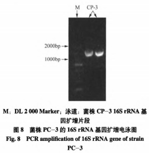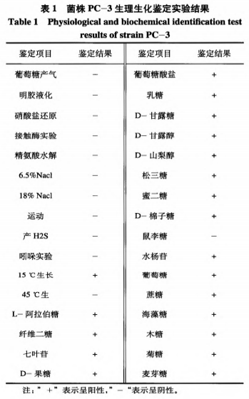 對(duì)菌種PC-3開(kāi)展生理學(xué)生化實(shí)驗(yàn)評(píng)定,結(jié)果見(jiàn)表1,將評(píng)定結(jié)論與《伯杰氏細(xì)菌鑒定手冊(cè)》和《乳酸細(xì)菌分類鑒定及實(shí)驗(yàn)方法》中對(duì)乳酸桿菌的生理學(xué)生化實(shí)驗(yàn)評(píng)定結(jié)果相比比,可基本評(píng)定所分開(kāi)的菌種PC-3為乳酸桿菌屬。
