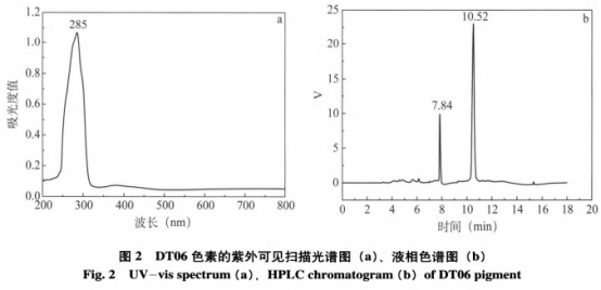 堿化的乙酸丁酯提取液經(jīng)蒸餾、工業(yè)甲醇復(fù)溶獲得高純黑色素水溶液,呈淡黃色(圖1)。DT06黑色素能溶解于水,有別于A.cristatus產(chǎn)的黃色素。黑色素甲醇溶液的紫外線由此可見(jiàn)掃描儀光譜儀如圖所示2a所顯示,在285nm上有特點(diǎn)消化吸收峰,與P.citreonigrum和E.rubrum黃色素各自在330nm和396nm處的特點(diǎn)消化吸收峰不一樣,285nm能夠 做為檢驗(yàn)光波長(zhǎng)用以高效液相色譜色譜和黑色素成分測(cè)量。