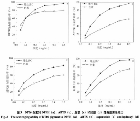 如圖所示3所顯示,在0~0.5mg/mL濃度值范疇內(nèi),伴隨著黑色素濃度值的提升,氧自由基清除率慢慢提升,當(dāng)濃度值為0.5mg/mL時(shí),黑色素對(duì)氧自由基正離子有較大的清除率,而且黑色素對(duì)DPPH氧自由基、ABTS氧自由基、超氧自由基及羥基自由基清除率IC50。各自為0.08mg/mL、0.37mg/mL、0.31mg/mL、0.24mg/mL,稍高于陽(yáng)性對(duì)照維他命C的IC50值,表明DT06黑色素具備優(yōu)良的清除自由基活力和不確定性的使用使用價(jià)值。