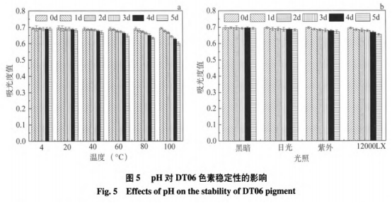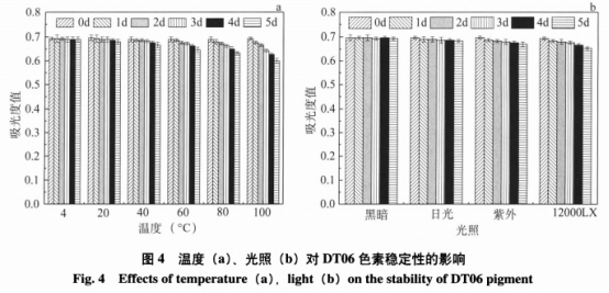 如圖4a所顯示,黃色素在4℃和20℃儲(chǔ)存5d后,其OD值值基本上沒(méi)轉(zhuǎn)變;伴隨著氣溫上升,OD值值略微降低,但在100℃標(biāo)準(zhǔn)下儲(chǔ)存5d后,保存率仍在86%之上,表明黃色素耐熱性不錯(cuò)。