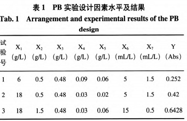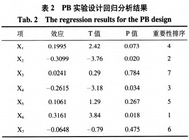 選用Minitabl7手機(jī)軟件對(duì)各要素開展PB試驗(yàn)設(shè)計(jì),結(jié)果如表1所顯示,各要素回歸系數(shù)和顯著性差異排列如表2所顯示,結(jié)果顯示:NaNO3(X2)、MgSO4·7H2O(X4)、CS(X6)的成分對(duì)黑色素生產(chǎn)量危害明顯,在其中X6對(duì)黑色素造成正效用的危害;X4、X2對(duì)黑色素造成負(fù)面效應(yīng)的危害。