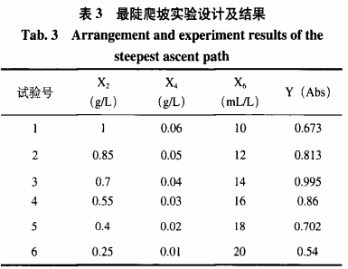 挑選適宜的步幅,對(duì)X2、X2、X6,3個(gè)明顯要素開展最陡上坡試驗(yàn),結(jié)果如表3所顯示,隨X2,X2,X6成分的提升,發(fā)酵物中黑色素OD值值(Y)先上升后減少,在第3組做到最大,因而以第3組濃度值做為響應(yīng)面試驗(yàn)的定位點(diǎn)。
