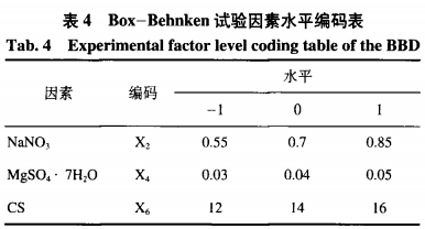 有回歸分析的方差分析(表6)得知:F=8.08、P=0.017(P<0.05)表明回歸分析明顯,決定系數(shù)R2=0.9357(R2>0.85),失擬項(xiàng)P=0.052(P>0.05)表明失擬項(xiàng)不明顯、回歸分析擬合程度優(yōu)良。由表7得知X2X2,X4X4的P值低于0.05,說明NaN03、MgS04·7H20的二次項(xiàng)模型擬合具備明顯危害,X6X6的P值低于0.01,說明CS的二次項(xiàng)模型擬合具備極明顯危害,而一次項(xiàng)和交互項(xiàng)的顯著性差異較弱,也證實(shí)了各要素與響應(yīng)值中間并不是線性相關(guān)。